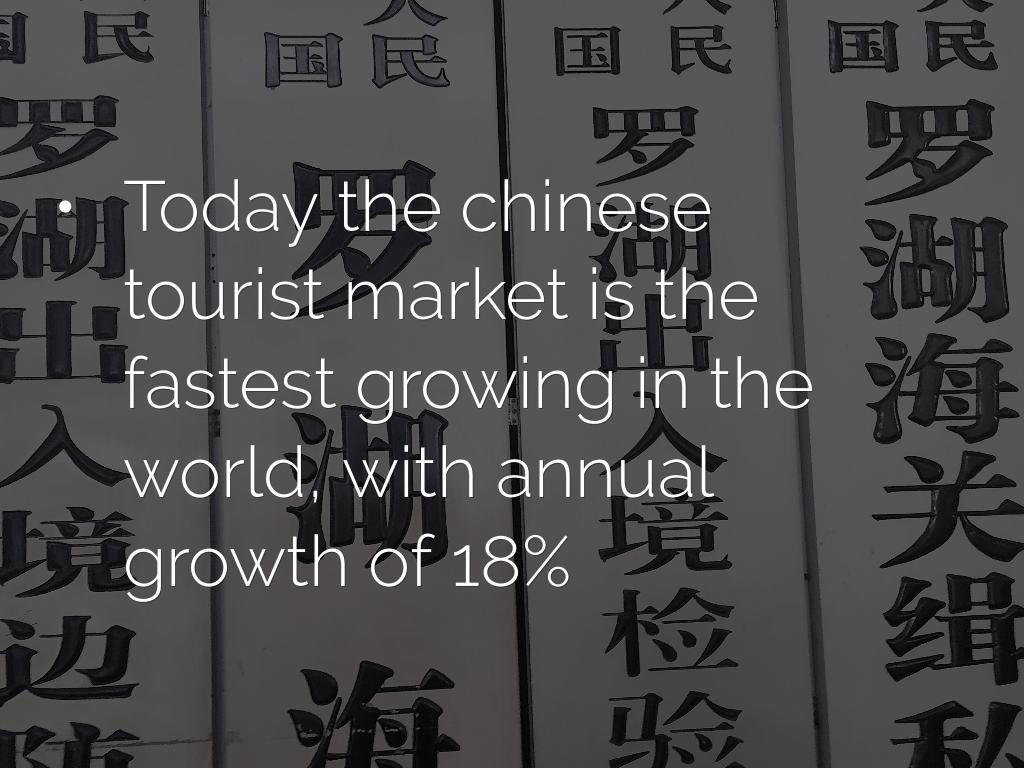 - Today the chinese tourist market is the fastest growing in the world, with annual growth of 18%