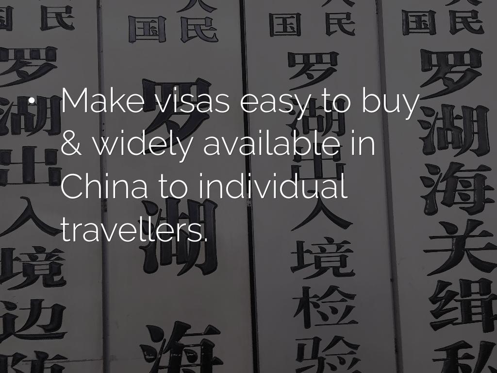 - Make visas easy to buy & widely available in China to individual travellers.