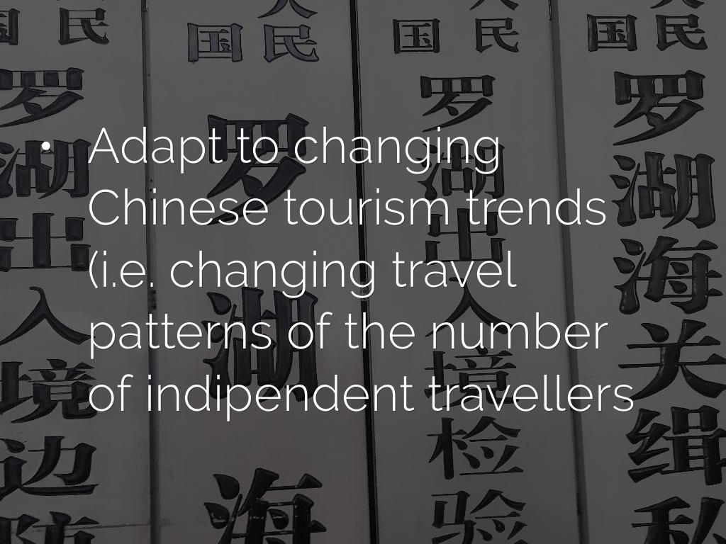 - Adapt to changing Chinese tourism trends (i.e. changing travel patterns of the number of indipendent travellers