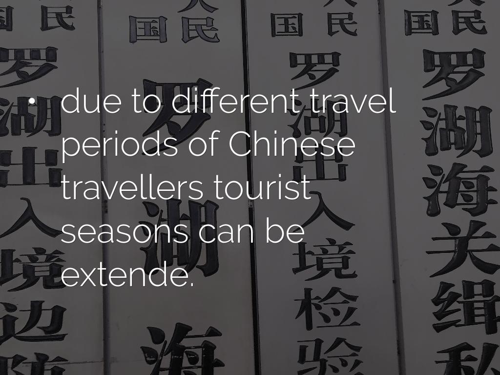 - due to different travel periods of Chinese travellers tourist seasons can be extende.