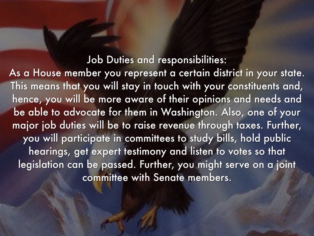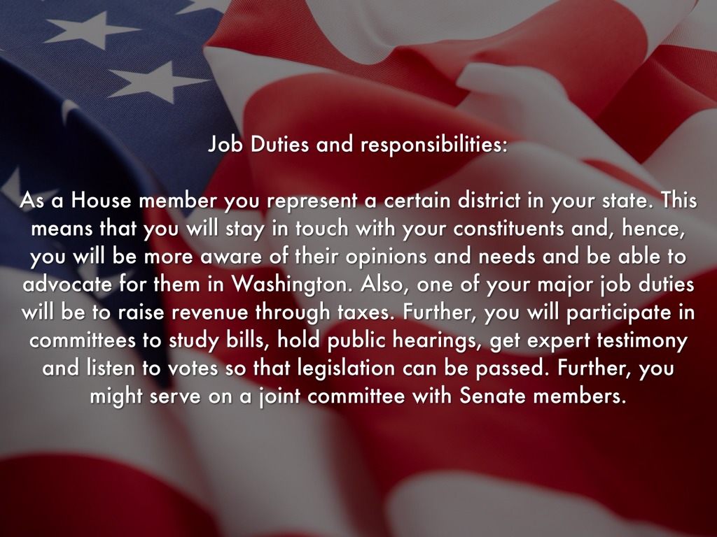 As a House member you represent a certain district in your state. This means that you will stay in touch with your constituents and, hence, you will be more aware of their opinions and needs and be able to advocate for them in Washington. Also, one of your major job duties will be to raise revenue through taxes. Further, you will participate in committees to study bills, hold public hearings, get expert testimony and listen to votes so that legislation can be passed. Further, you might serve on a joint committee with Senate members.