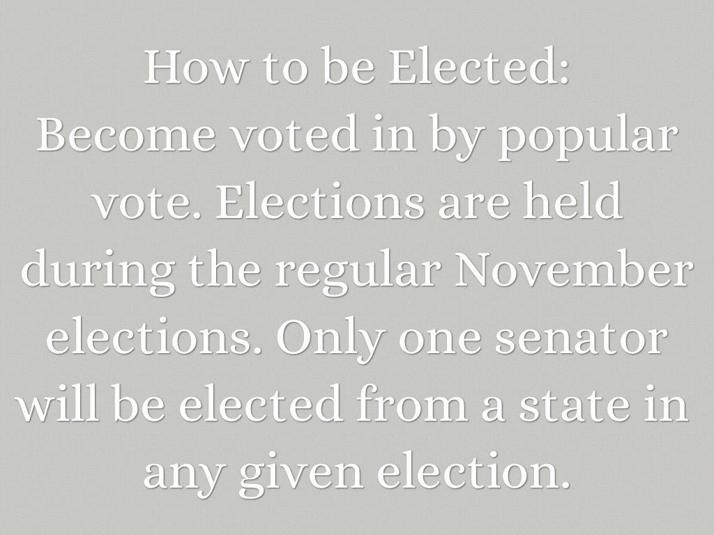 Become voted in by popular vote. Elections are held during the regular November elections. Only one senator will be elected from a state in any given election.