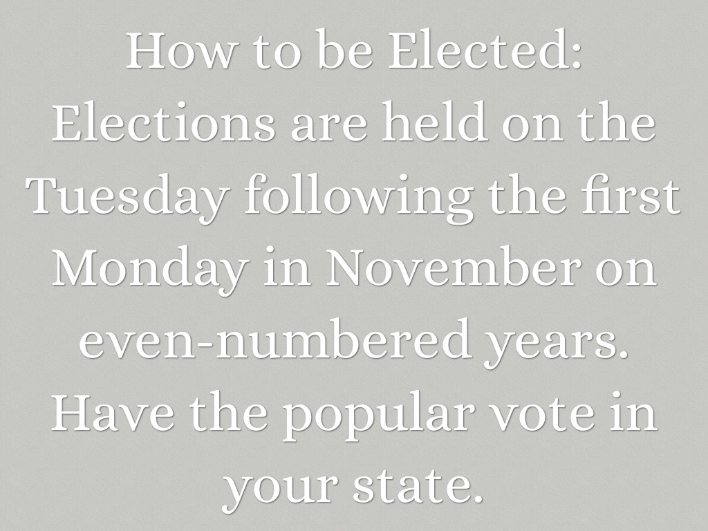 Elections are held on the Tuesday following the first Monday in November on even-numbered years. Have the popular vote in your state.