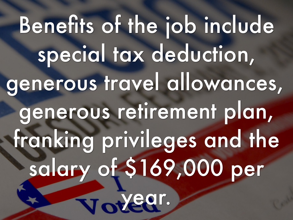 Benefits of the job include special tax deduction, generous travel allowances, generous retirement plan, franking privileges and the salary of $169,000 per year.