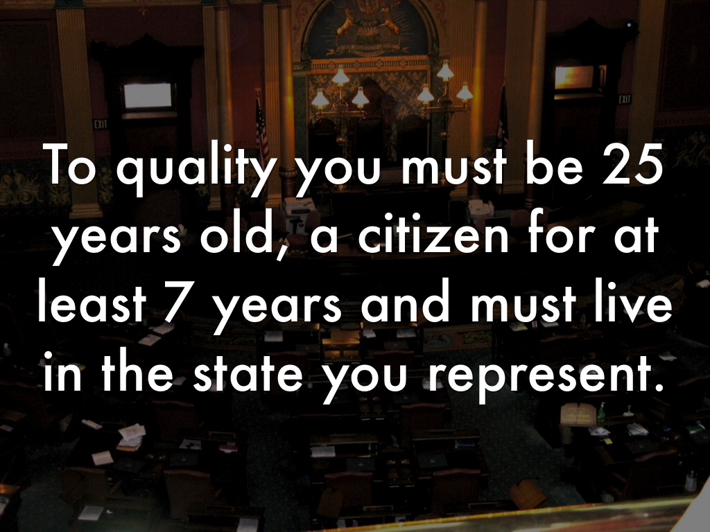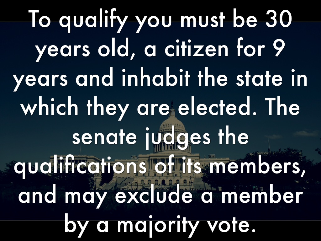 To qualify you must be 30 years old, a citizen for 9 years and inhabit the state in which they are elected. The senate judges the qualifications of its members, and may exclude a member by a majority vote.
