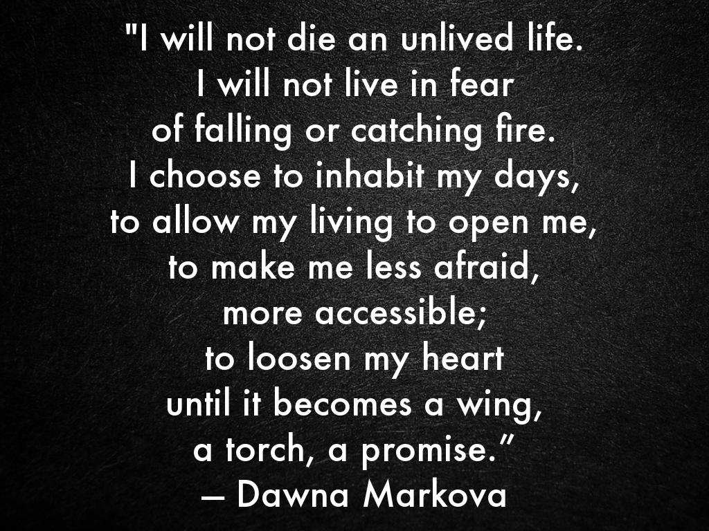 "I will not die an unlived life. I will not live in fear of falling or catching fire. I choose to inhabit my days, to allow my living to open me, to make me less afraid, more accessible; to loosen my heart until it becomes a wing, a torch, a promise.” — Dawna Markova