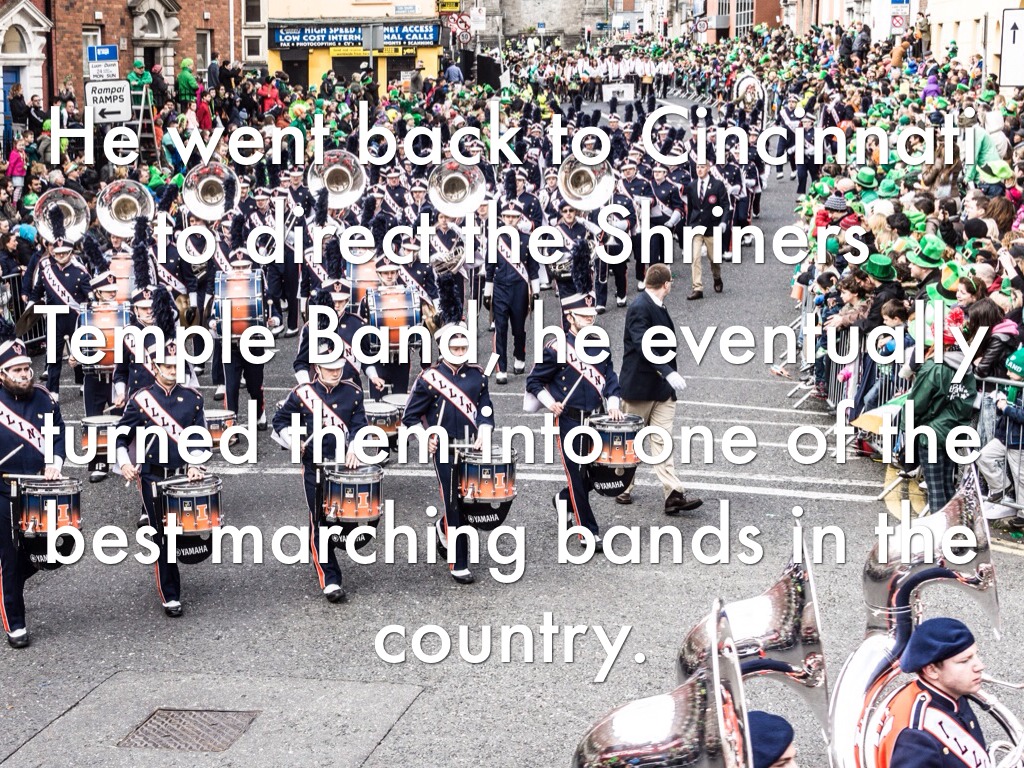 He went back to Cincinnati to direct the Shriners Temple Band, he eventually turned them into one of the best marching bands in the country.