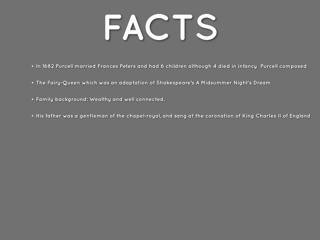In 1682 Purcell married Frances Peters and had 6 children although 4 died in infancy Purcell composed
