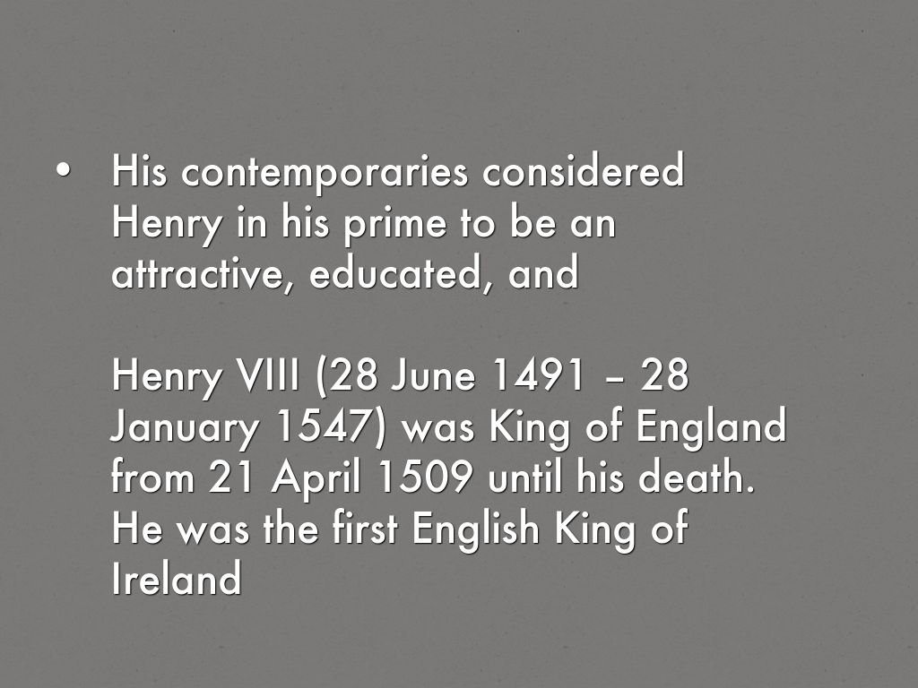 His contemporaries considered Henry in his prime to be an attractive, educated, and Henry VIII (28 June 1491 – 28 January 1547) was King of England from 21 April 1509 until his death. He was the first English King of Ireland