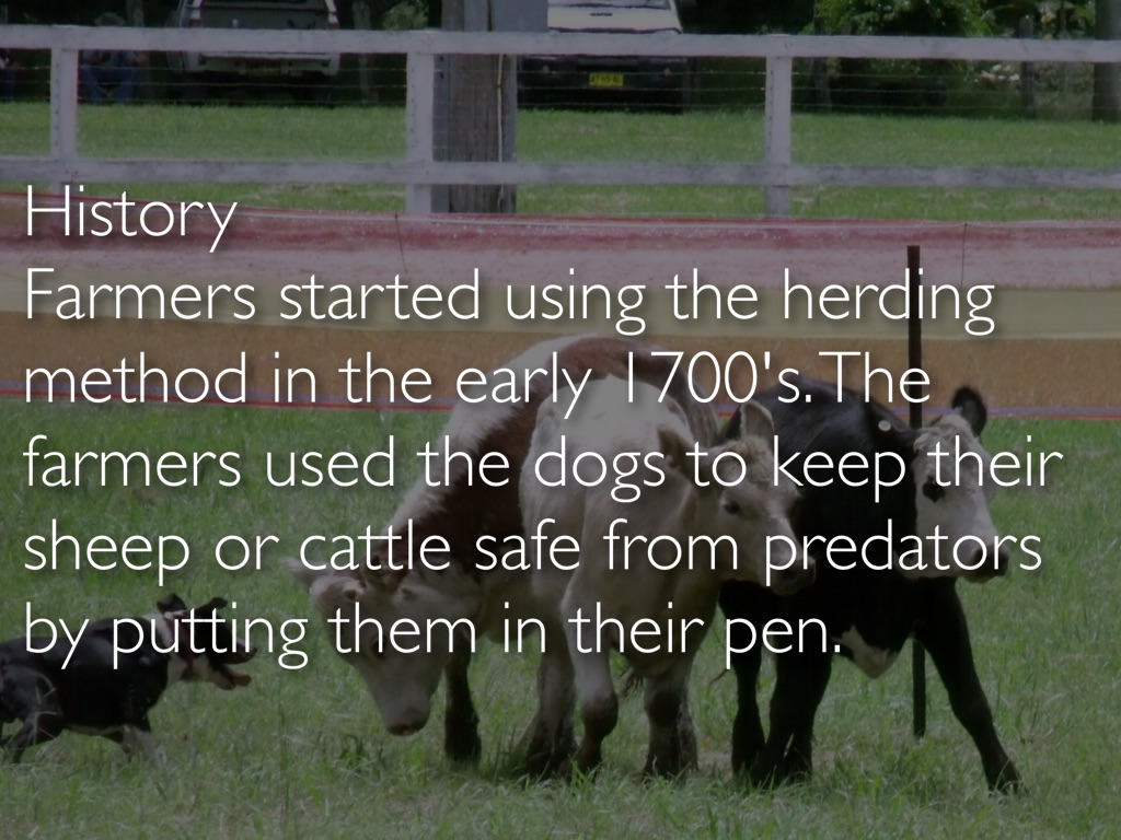 History Farmers started using the herding method in the early 1700's. The farmers used the dogs to keep their sheep or cattle safe from predators by putting them in their pen.