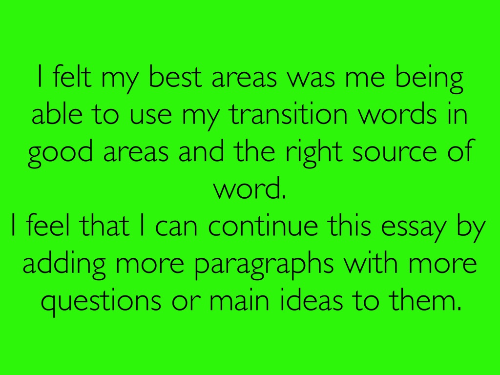 I felt my best areas was me being able to use my transition words in good areas and the right source of word. I feel that I can continue this essay by adding more paragraphs with more questions or main ideas to them.