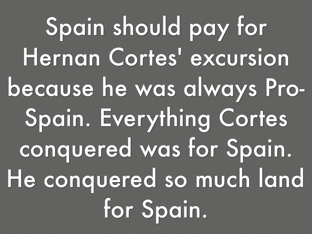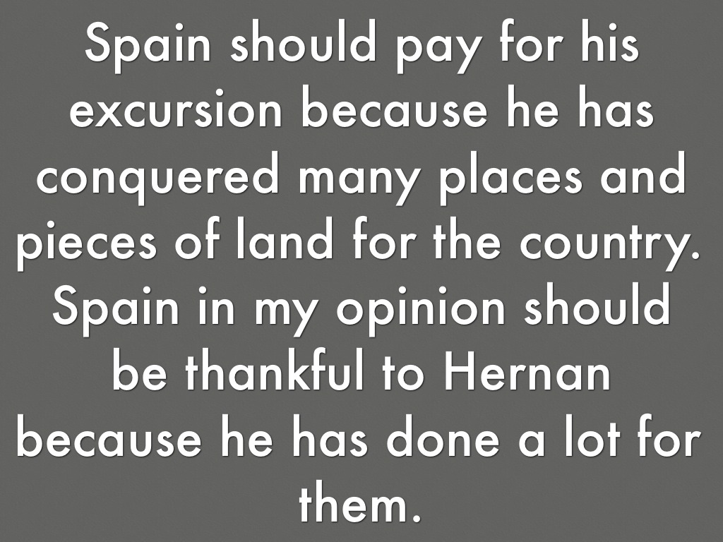 Spain should pay for his excursion because he has conquered many places and pieces of land for the country. Spain in my opinion should be thankful to Hernan because he has done a lot for them.