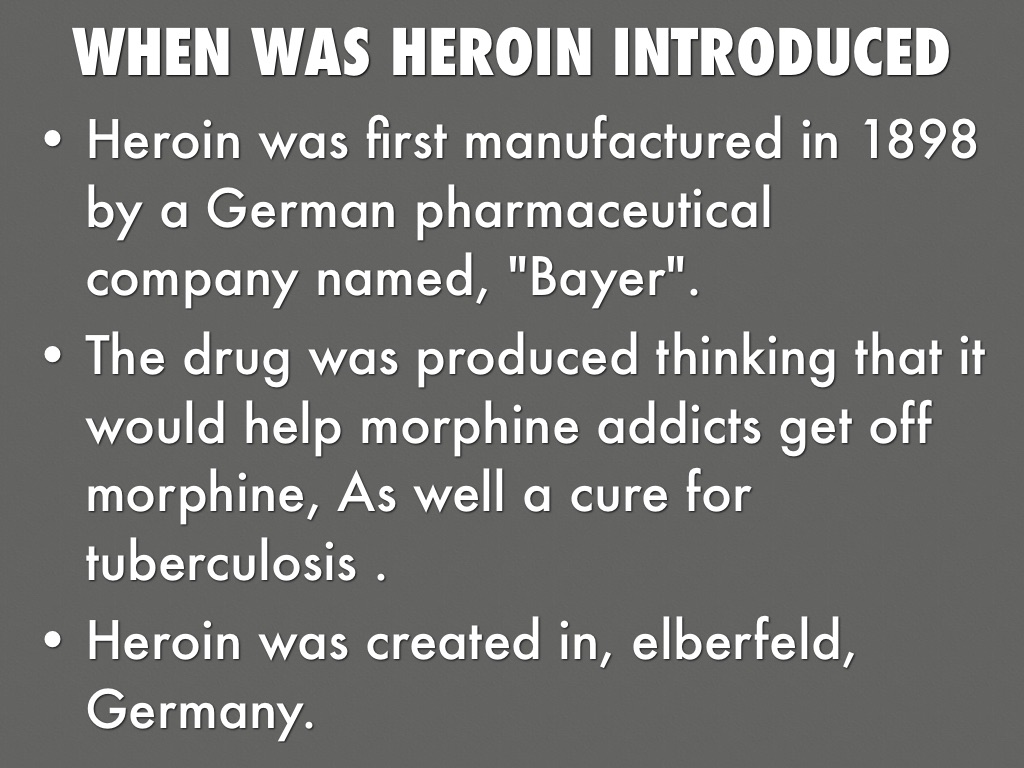 Heroin was first manufactured in 1898 by a German pharmaceutical company named, "Bayer".