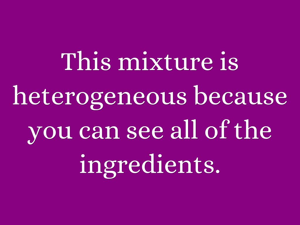 This mixture is heterogeneous because you can see all of the ingredients.