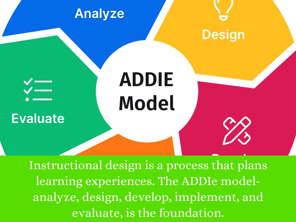 Instructional design is a process that plans learning experiences. The ADDIe model- analyze, design, develop, implement, and evaluate, is the foundation.