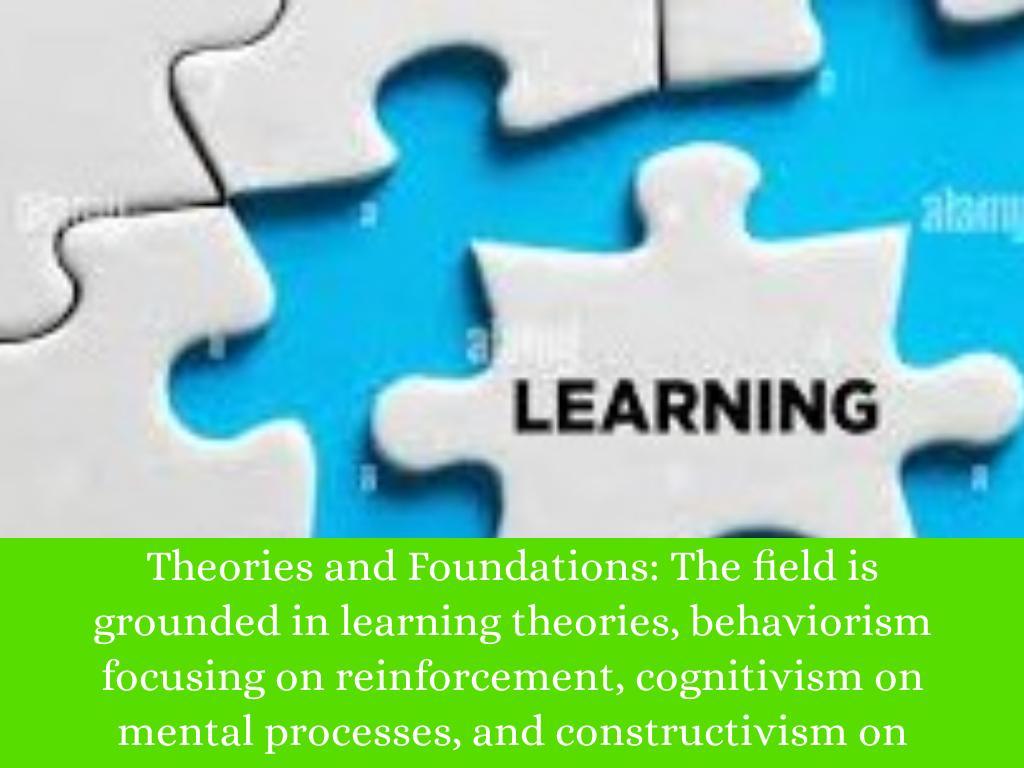 Theories and Foundations: The field is grounded in learning theories, behaviorism focusing on reinforcement, cognitivism on mental processes, and constructivism on learners building their own meaning.