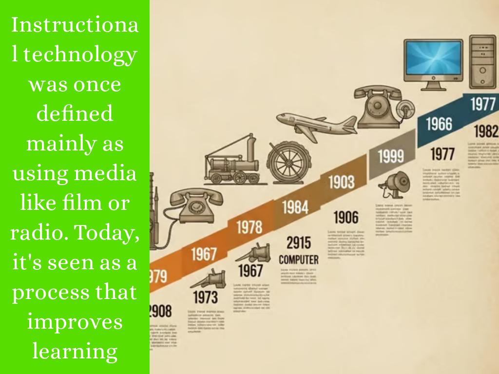 Instructional technology was once defined mainly as using media like film or radio. Today, it's seen as a process that improves learning
