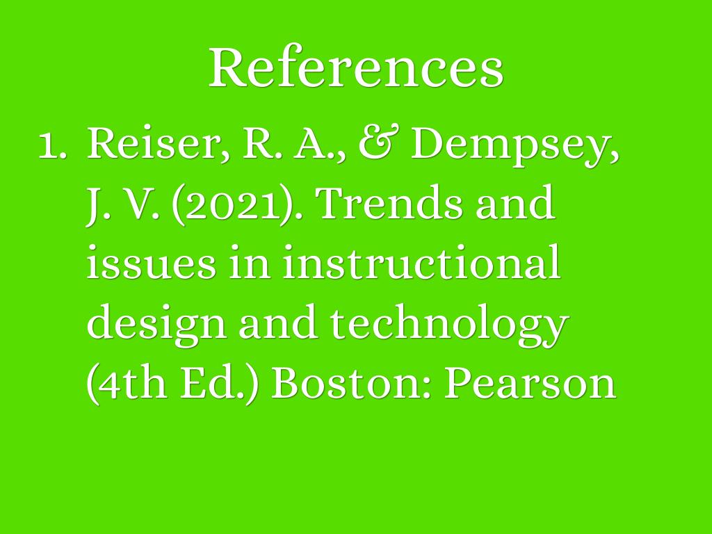 - Reiser, R. A., & Dempsey, J. V. (2021). Trends and issues in instructional design and technology (4th Ed.) Boston: Pearson
