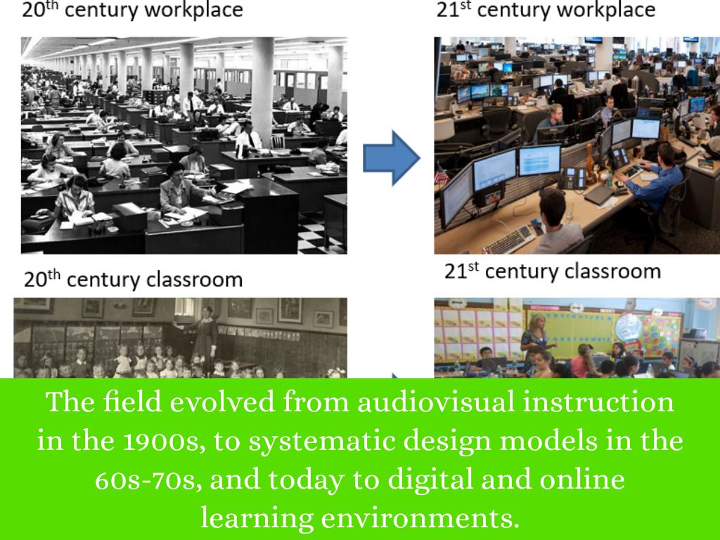 The field evolved from audiovisual instruction in the 1900s, to systematic design models in the 60s-70s, and today to digital and online learning environments.