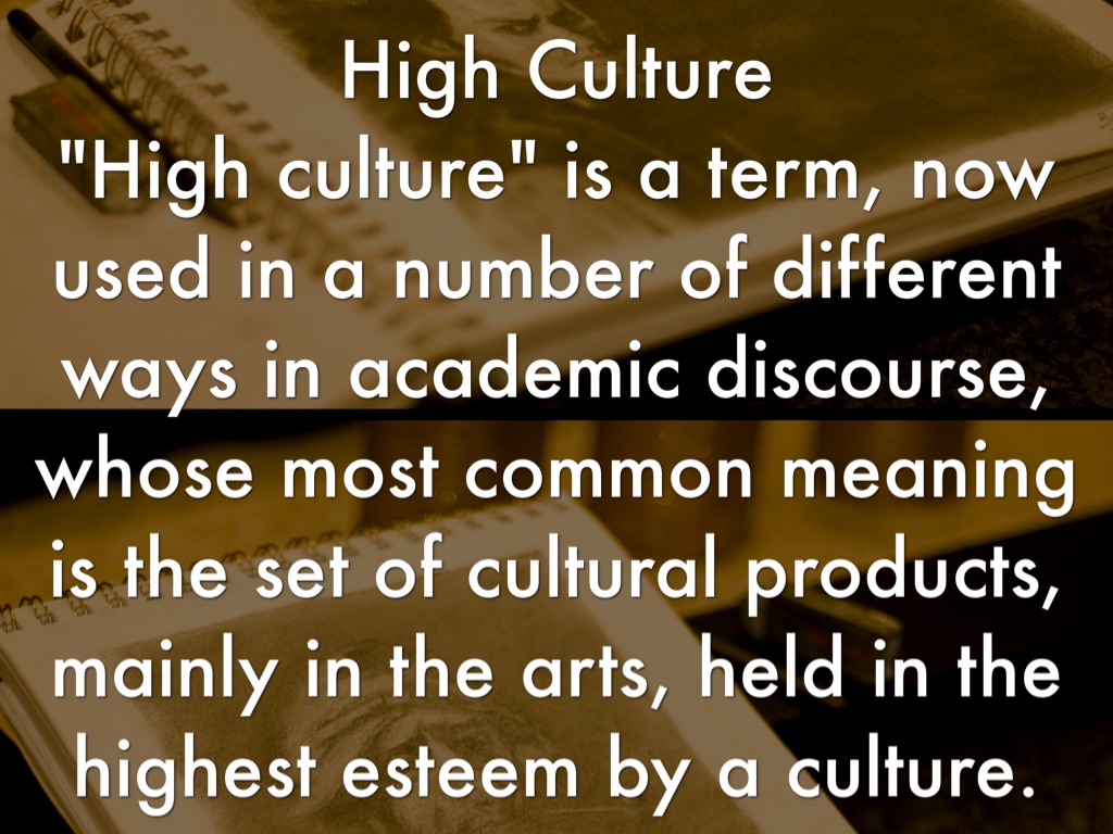 "High culture" is a term, now used in a number of different ways in academic discourse, whose most common meaning is the set of cultural products, mainly in the arts, held in the highest esteem by a culture.