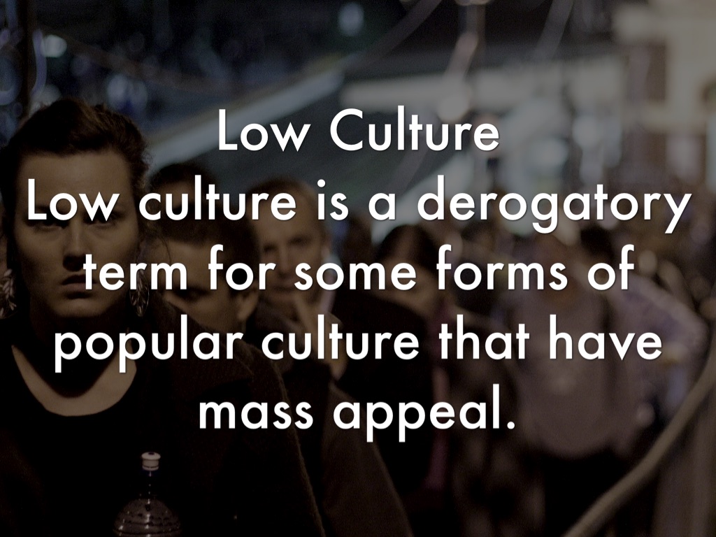 Low culture is a derogatory term for some forms of popular culture that have mass appeal.