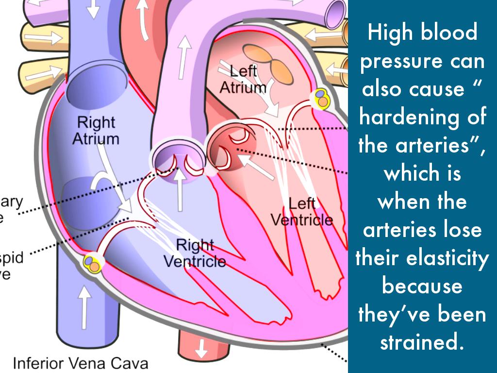 High blood pressure can also cause “ hardening of the arteries”, which is when the arteries lose their elasticity because they’ve been strained.