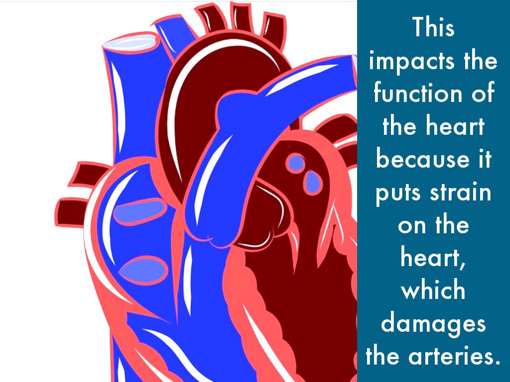 This impacts the function of the heart because it puts strain on the heart, which damages the arteries.