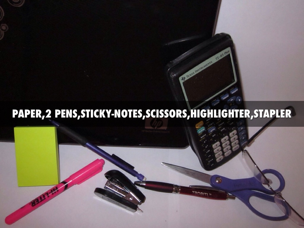 PAPER,2 PENS,STICKY-NOTES,SCISSORS,HIGHLIGHTER,STAPLER