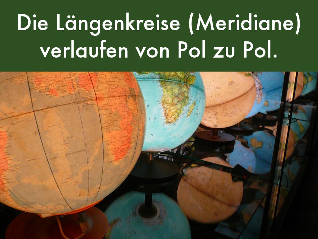 Die Längenkreise (Meridiane) verlaufen von Pol zu Pol.