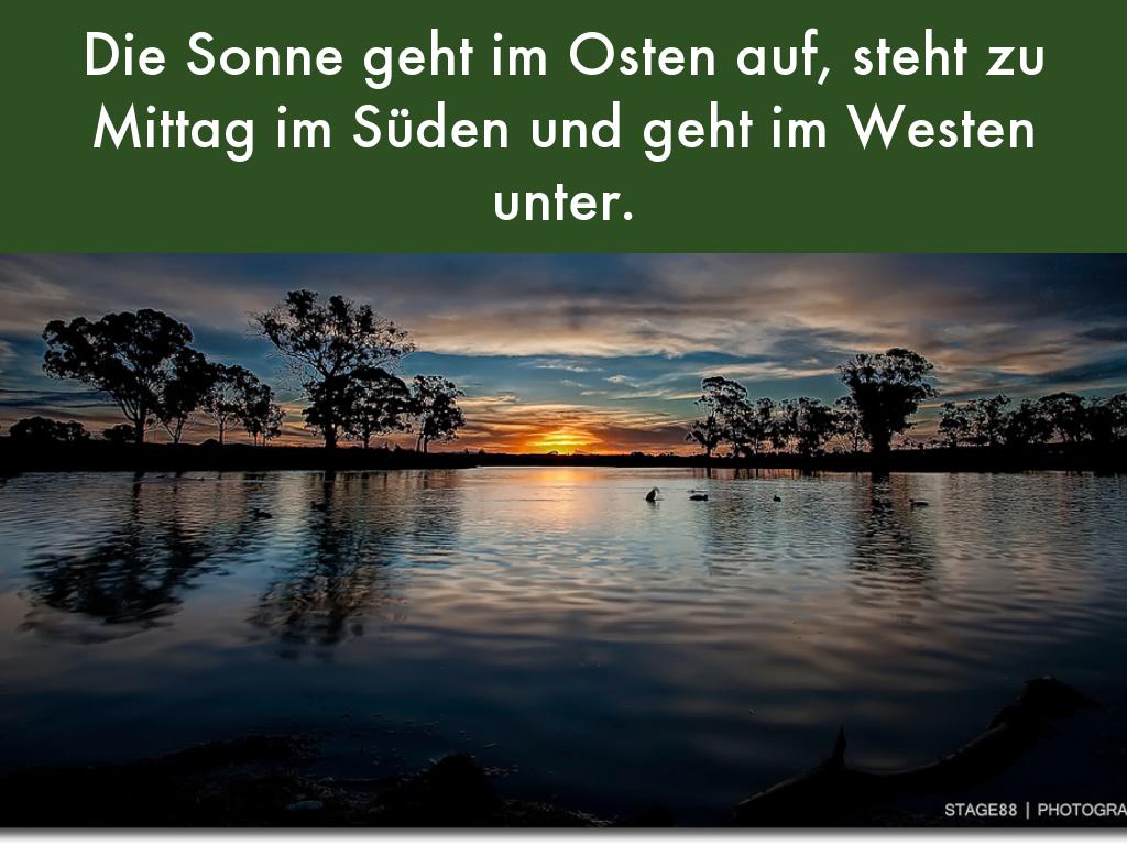 Die Sonne geht im Osten auf, steht zu Mittag im Süden und geht im Westen unter.