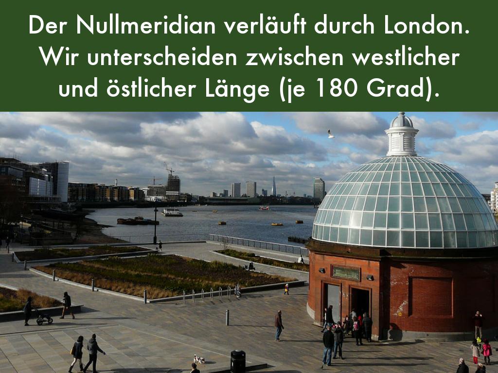Der Nullmeridian verläuft durch London. Wir unterscheiden zwischen westlicher und östlicher Länge (je 180 Grad).