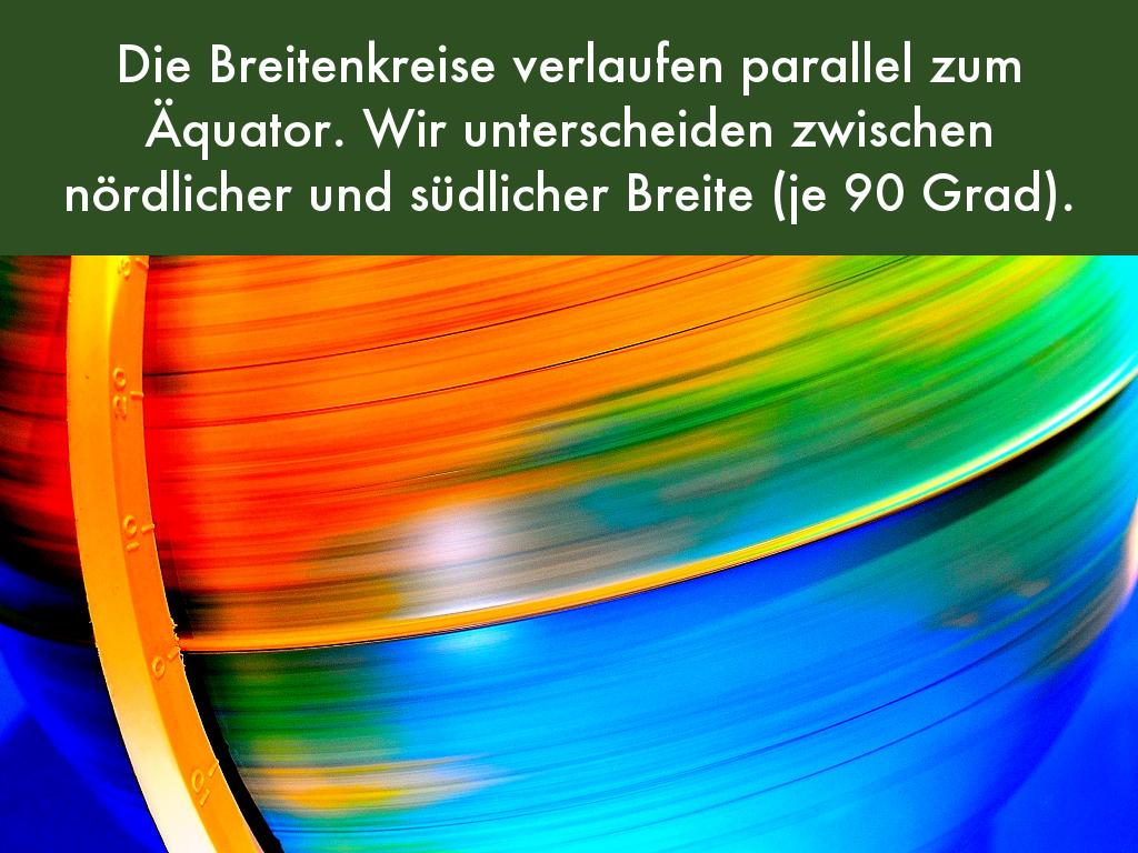 Die Breitenkreise verlaufen parallel zum Äquator. Wir unterscheiden zwischen nördlicher und südlicher Breite (je 90 Grad).