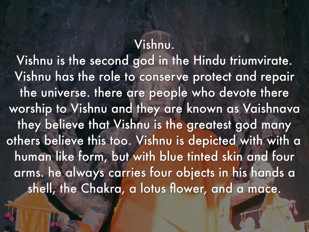 Vishnu. Vishnu is the second god in the Hindu triumvirate. Vishnu has the role to conserve protect and repair the universe. there are people who devote there worship to Vishnu and they are known as Vaishnava they believe that Vishnu is the greatest god many others believe this too. Vishnu is depicted with with a human like form, but with blue tinted skin and four arms. he always carries four objects in his hands a shell, the Chakra, a lotus flower, and a mace.