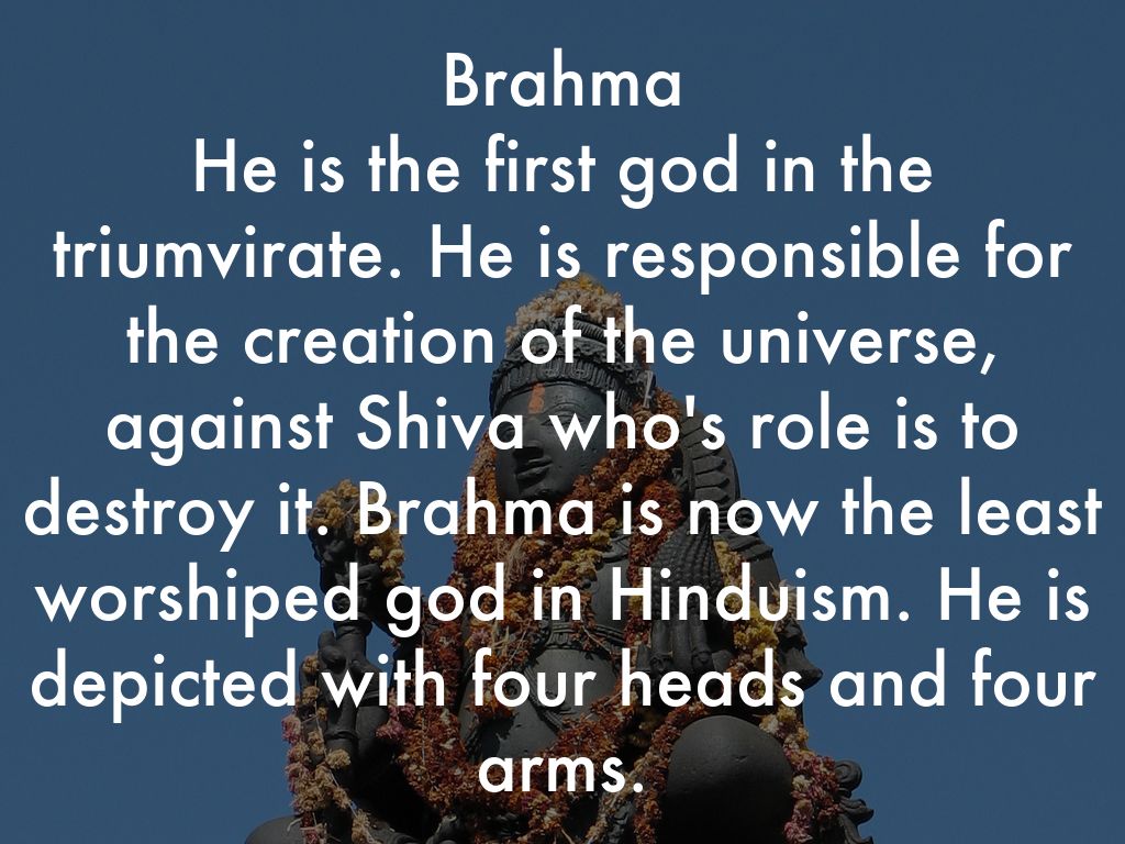 Brahma He is the first god in the triumvirate. He is responsible for the creation of the universe, against Shiva who's role is to destroy it. Brahma is now the least worshiped god in Hinduism. He is depicted with four heads and four arms.