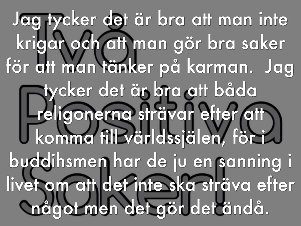 Jag tycker det är bra att man inte krigar och att man gör bra saker för att man tänker på karman. Jag tycker det är bra att båda religonerna strävar efter att komma till världssjälen, för i