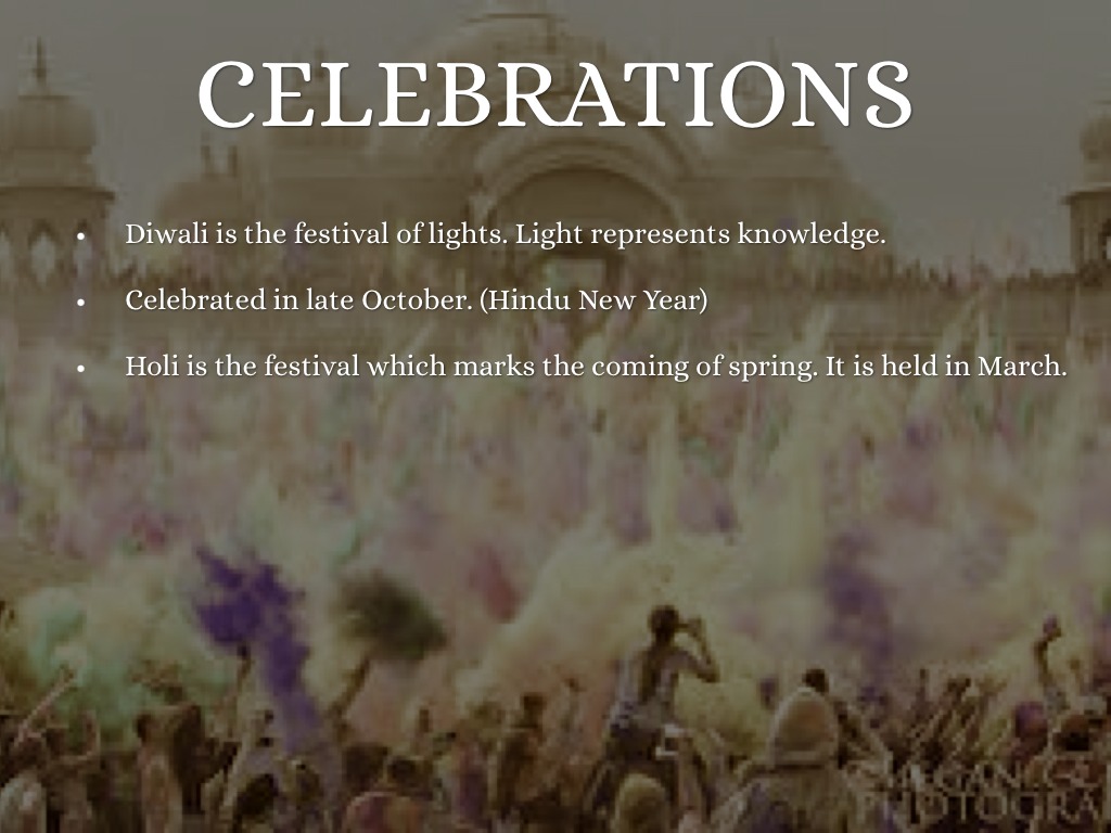 • Holi is the festival which marks the coming of spring. It is held in March.