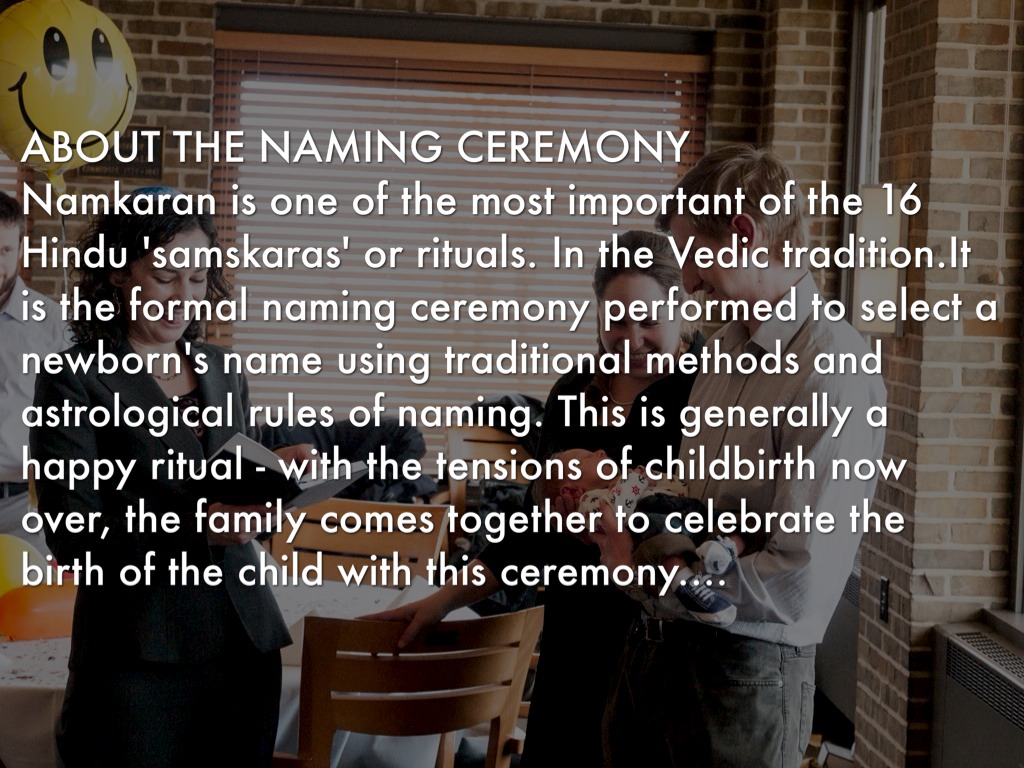 ABOUT THE NAMING CEREMONY Namkaran is one of the most important of the 16 Hindu 'samskaras' or rituals. In the Vedic tradition.It is the formal naming ceremony performed to select a newborn's name using traditional methods and astrological rules of naming. This is generally a happy ritual - with the tensions of childbirth now over, the family comes together to celebrate the birth of the child with this ceremony.