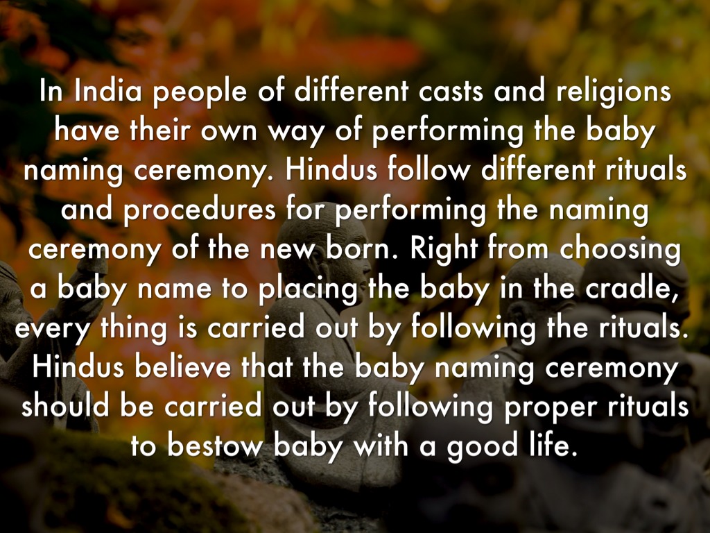 In India people of different casts and religions have their own way of performing the baby naming ceremony. Hindus follow different rituals and procedures for performing the naming ceremony of the new born. Right from choosing a baby name to placing the baby in the cradle, every thing is carried out by following the rituals. Hindus believe that the baby naming ceremony should be carried out by following proper rituals to bestow baby with a good life.