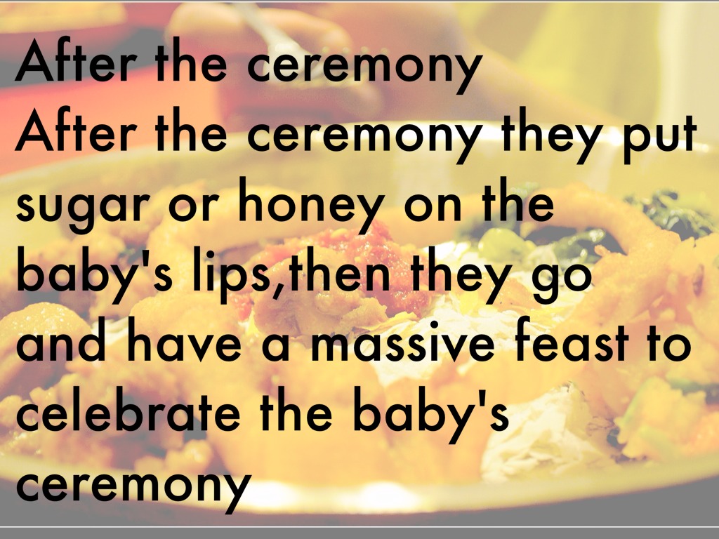After the ceremony After the ceremony they put sugar or honey on the baby's lips,then they go and have a massive feast to celebrate the baby's ceremony