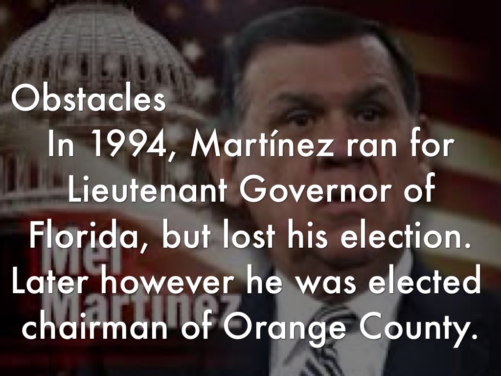 Obstacles In 1994, Martínez ran for Lieutenant Governor of Florida, but lost his election. Later however he was elected chairman of Orange County.