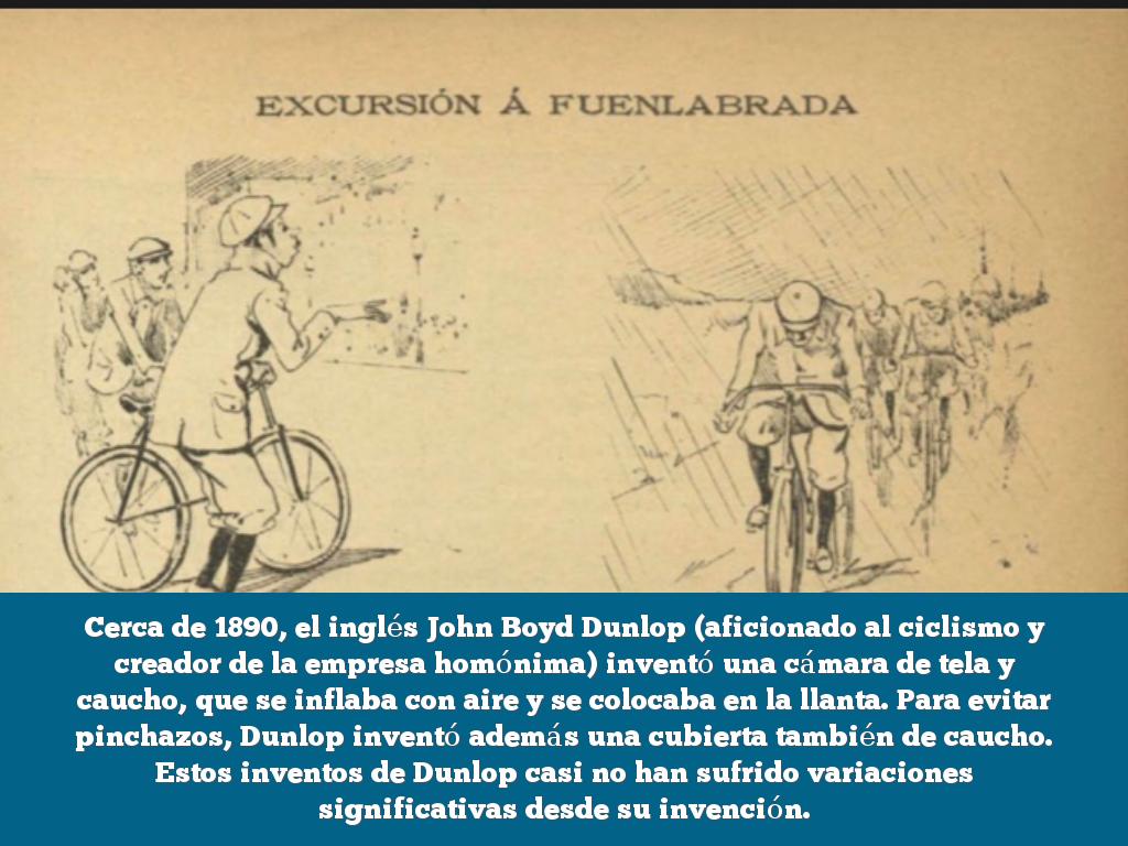 Cerca de 1890, el inglés John Boyd Dunlop (aficionado al ciclismo y creador de la empresa homónima) inventó una cámara de tela y caucho, que se inflaba con aire y se colocaba en la llanta. Para evitar pinchazos, Dunlop inventó además una cubierta también de caucho. Estos inventos de Dunlop casi no han sufrido variaciones significativas desde su invención.