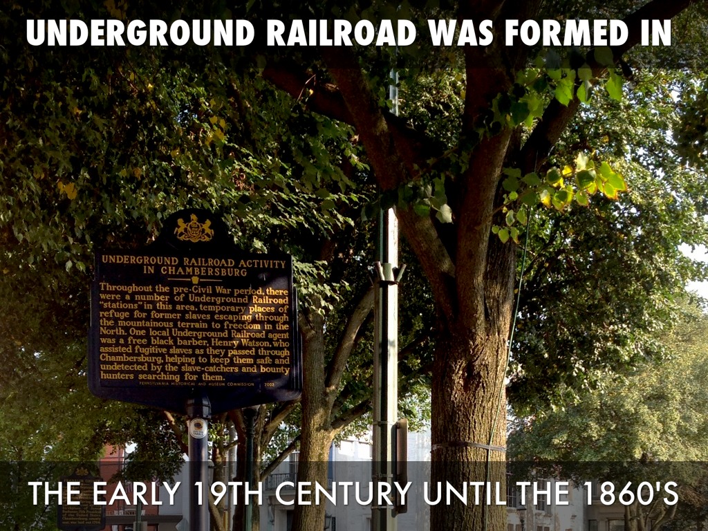 B. The Underground Railroad was an event to help slaves to escape from the south to freedom in the north. Stations in Chambersburg were for former slaves escaping through the mountainous terrain to freedom in the north. This was a very dangerous and illegal event.