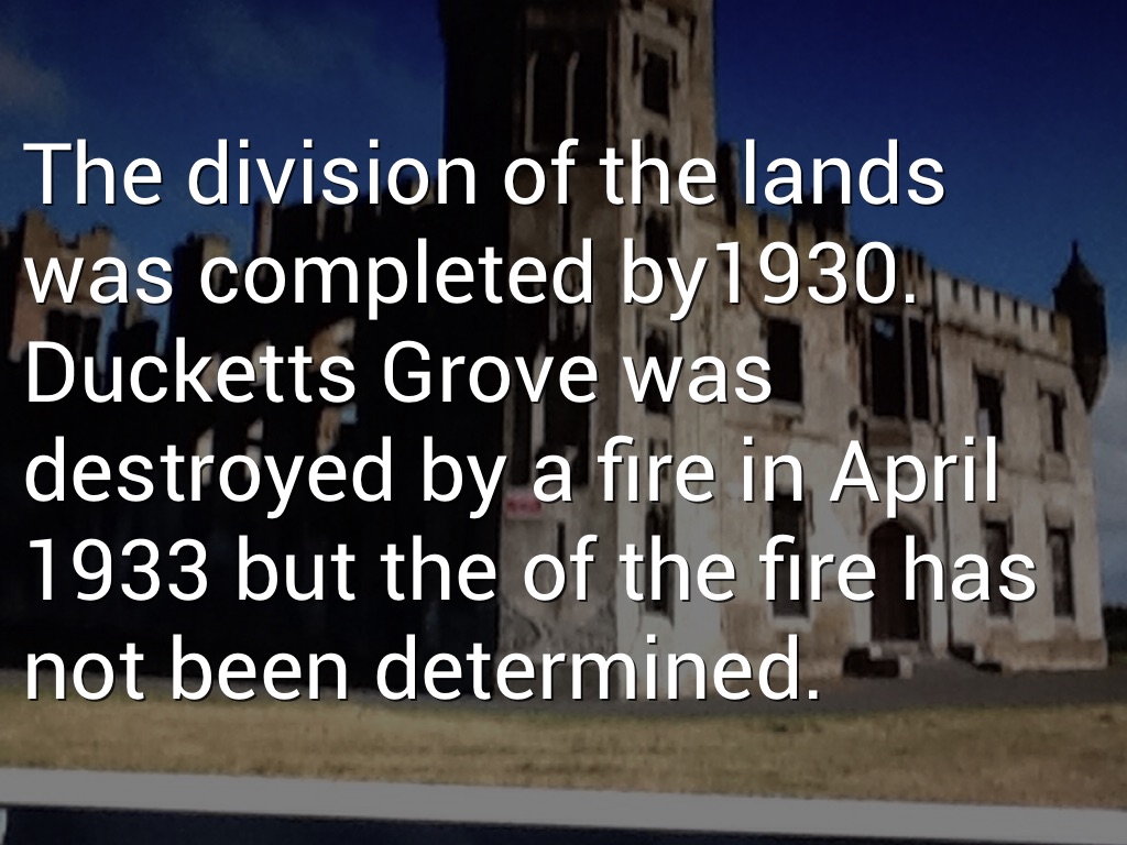 The division of the lands was completed by1930. Ducketts Grove was destroyed by a fire in April 1933 but the of the fire has not been determined.