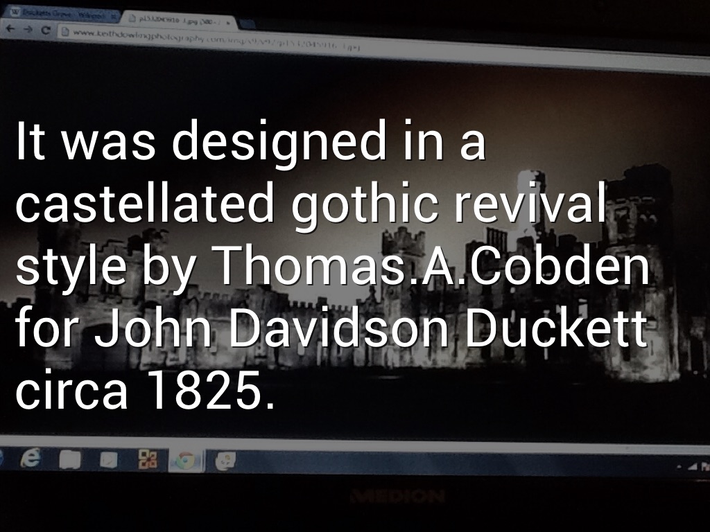 It was designed in a castellated gothic revival style by Thomas.A.Cobden for John Davidson Duckett circa 1825.
