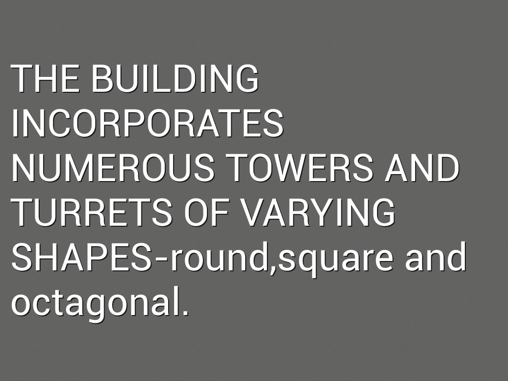 THE BUILDING INCORPORATES NUMEROUS TOWERS AND TURRETS OF VARYING SHAPES-round,square and octagonal.