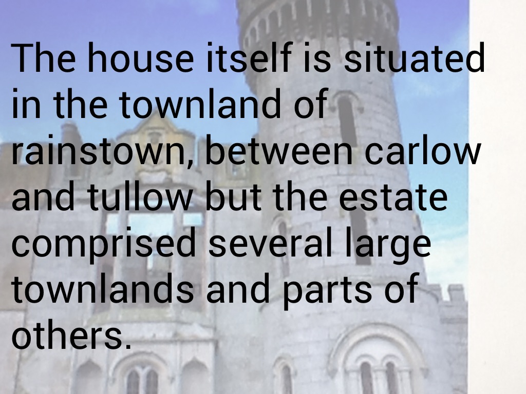 The house itself is situated in the townland of rainstown, between carlow and tullow but the estate comprised several large townlands and parts of others.