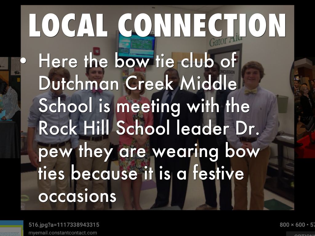 Here the bow tie club of Dutchman Creek Middle School is meeting with the Rock Hill School leader Dr. pew they are wearing bow ties because it is a festive occasions