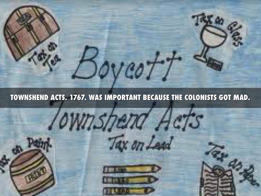 TOWNSHEND ACTS. 1767. WAS IMPORTANT BECAUSE THE COLONISTS GOT MAD.