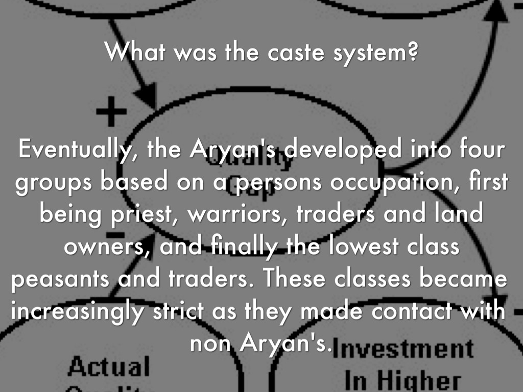 Eventually, the Aryan's developed into four groups based on a persons occupation, first being priest, warriors, traders and land owners, and finally the lowest class peasants and traders. These classes became increasingly strict as they made contact with non Aryan's.