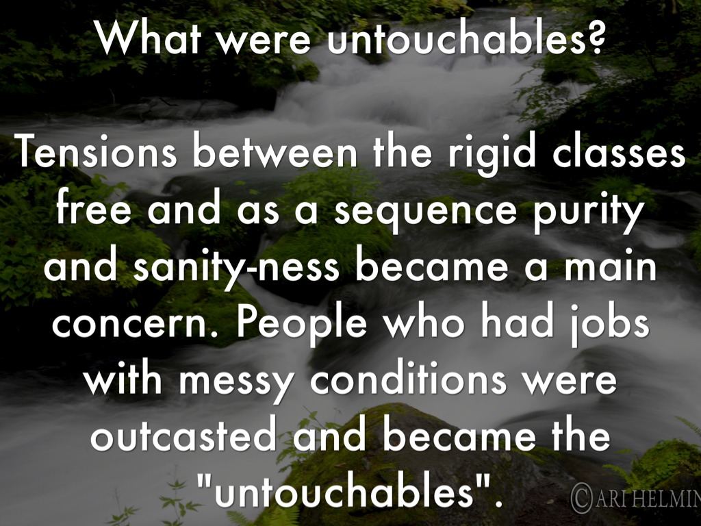 Tensions between the rigid classes free and as a sequence purity and sanity-ness became a main concern. People who had jobs with messy conditions were outcasted and became the "untouchables".